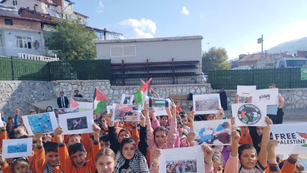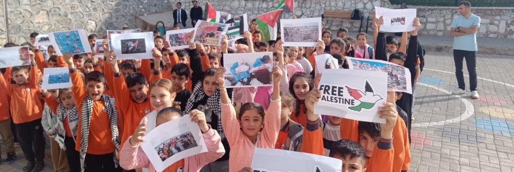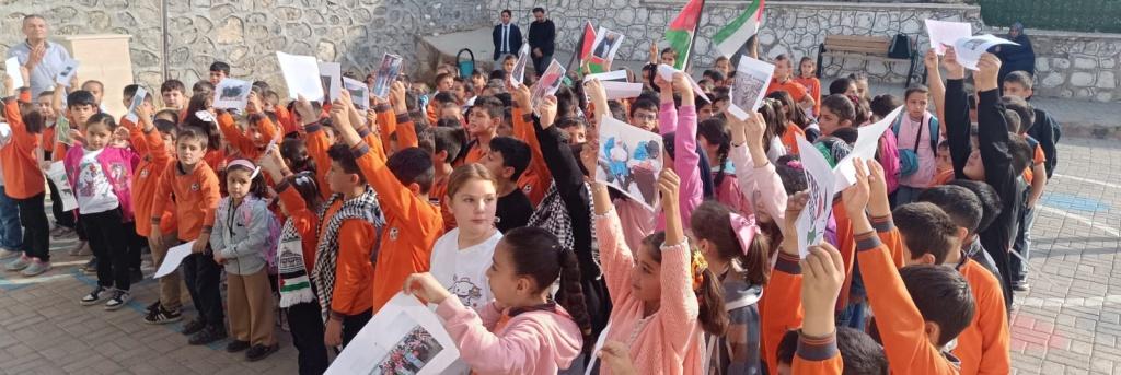 Millî Eğitim Bakanımız Yusuf Tekin'in öncülüğünde 81 ildeki bütün okullarda öğrencilerin katılımıyla eşzamanlı olarak Filistin ve Gazze temalı farkındalık etkinlikleri yapıldı. Bu kapsamda okulumuzda yapılan etkinliklerle bakanlığımızın; "Türkiye Yüzyılı Maarif Modeli temel hak ve hürriyetler perspektifinde koşulsuz insan haklarına saygı, küresel barış ve dünyaya saygı ilkelerini merkeze konumlandırır. Bu yüksek kurumsal ve ahlaki sorumluluk bilinci doğrultusunda, yarın sabah tüm okullarda eşzamanlı farkındalık etkinlikleri düzenlenmesini istiyoruz. Bu etkinliklerle, Filistin'deki insan hakları ihlallerinin sona erdirilmesine yönelik kararlı desteğimizi somut biçimde göstermek ve gençlerin insan hakları ile demokratik duyarlılığını, ortak sorumluluk bilincini en üst düzeyde pekiştirmek amaçlanmaktadır. Bu organizasyonun, öğrencilerde insan hakları savunuculuğu bilincinin köklü biçimde inşasına zemin hazırlayacağı değerlendirilmektedir. Türkiye Yüzyılı Maarif Modeli'nin (TYMM) Erdem-Değer-Eylem yaklaşımı esas alınarak, öğrencilerin ulusal ve evrensel meseleler karşısında eleştirel düşünme becerisi ve sorumluluk bilinci geliştirmeleri hedeflenmelidir. Bu etkinlikler, aynı zamanda TYMM'nin birey, aile, toplum ve çevre yaklaşımının hayata geçirilmesi için somut bir zemin hazırlayacaktır." hedefine ulaşılmasına çalışılmıştır...